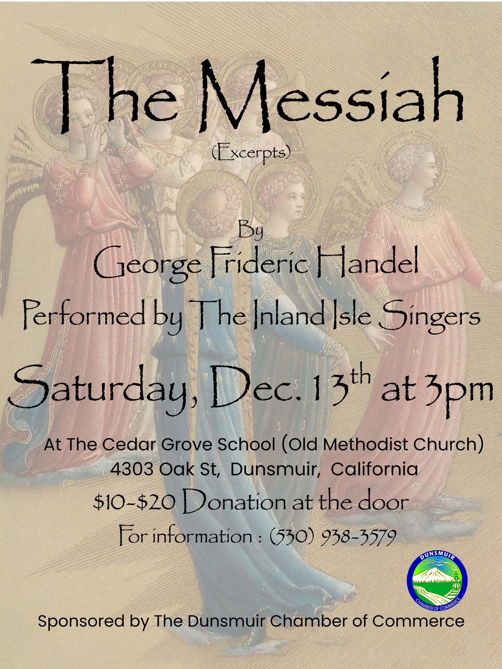 The Inland Isle Singers, a choir from the Mt. Shasta area, will present the first section of G.F. Handel’s great work, “The Messiah” on Saturday December 13 th at 3:00pm at Cedar Grove (The Old Methodist Church), in a concert sponsored by the Dunsmuir Chamber of Commerce.