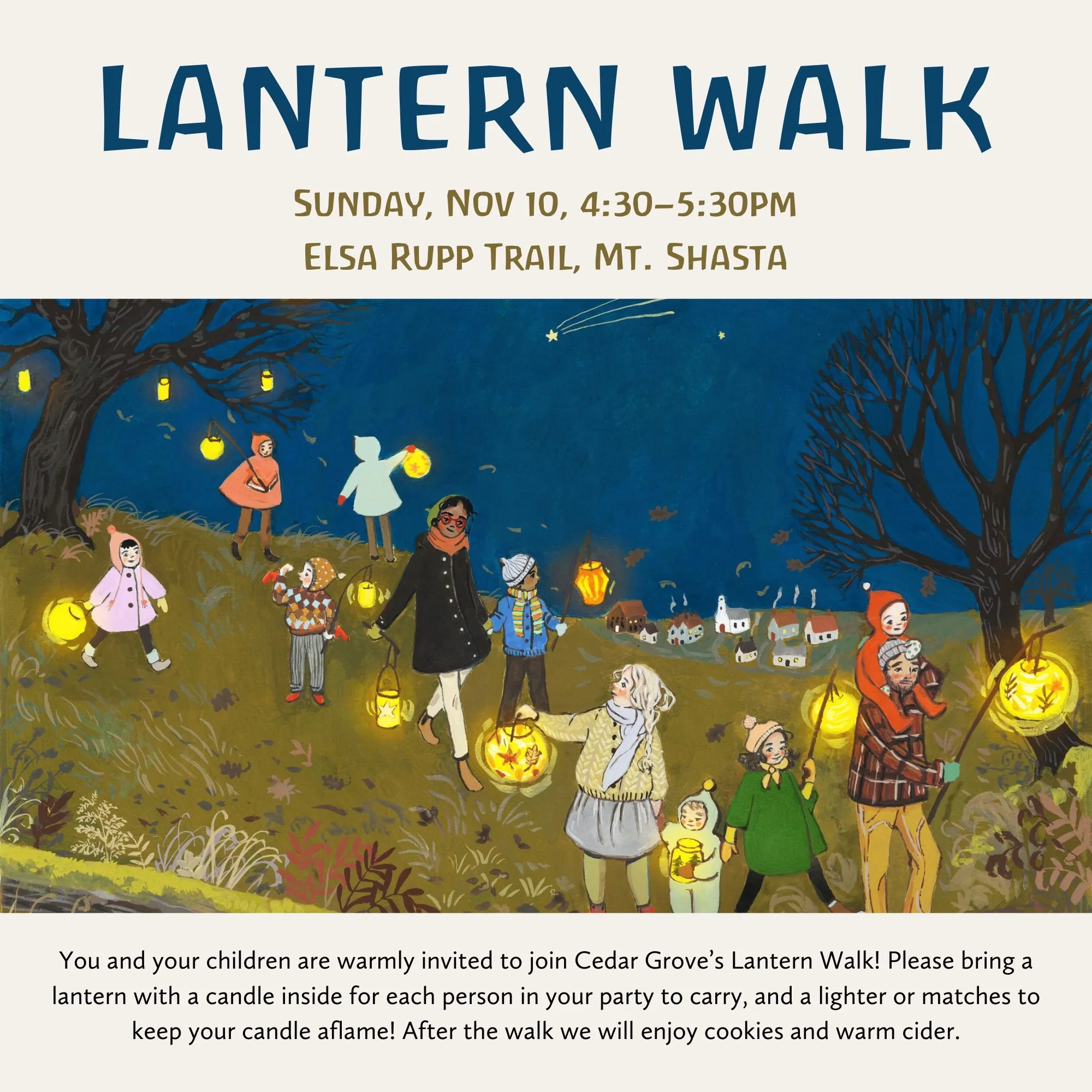 Order of events: We will gather at 4:30pm in the parking lot at Elsa Rupp Trail. We'll light our lanterns, practice singing our "lantern songs" a few times together, and then take a little walk through the woods. After the walk we will enjoy some cookies and warm cider together, then say goodbye.